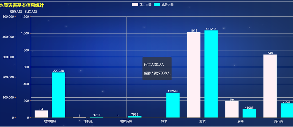 行政单元可按行政单元(含省、市、县、乡)查询统计灾害点数量(按灾害类型)、灾情、险情、隐患点数量(按灾害类型)、遥感解译点、勘查、搬迁避让、工程治理点数量、速报点、核销点,形成统计文本和统计图。